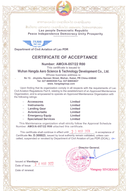 2001年10月 公司獲中國民航總局授權的民航維修許可證。